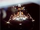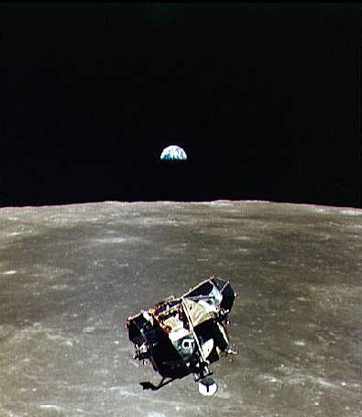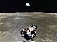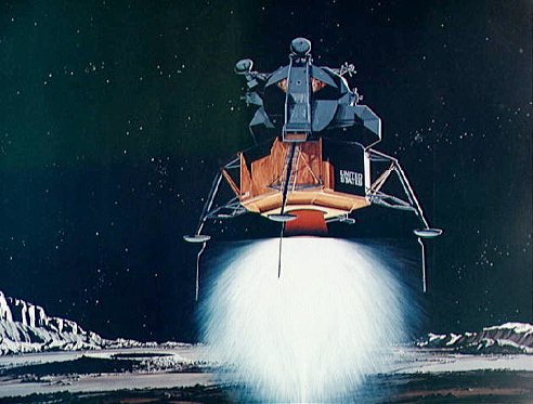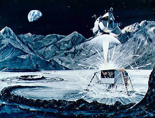 July 21, departure after 22 hours on the moon. Left - Artist's concept of the firing of the ascent engine as the lunar module ascent stage is launched. The descent stage serves as a launch base and remains on the lunar surface. It bears a plaque with a unique inscription.. Right - The lunar module making its docking approach to the command module in lunar orbit as Earth rises above the horizon. Astronaut Michael Collins had remained in the command module in orbit while his fellow crewmen explored the lunar surface.