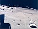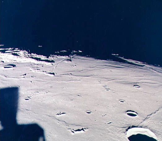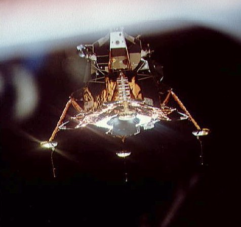 Left - Landing approach to the southwestern edge of the Sea of Tranquility as seen from the lunar module. The landing site is located just right of center at the edge of darkness. The crater Maskelyne is the large one at the lower right. Mid - The lunar module "Eagle," now separated, as seen from the command module before its descent to the surface. Right - Artist's concept of the "Eagle" landing on the surface of the moon, establishing "Tranquility Base." In reality, at an altitude of 500 feet, the astronauts discovered the smooth plain they expected was actually a crater lined with boulders. Armstrong then piloted to a more suitable spot as landing fuel ran very low.