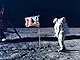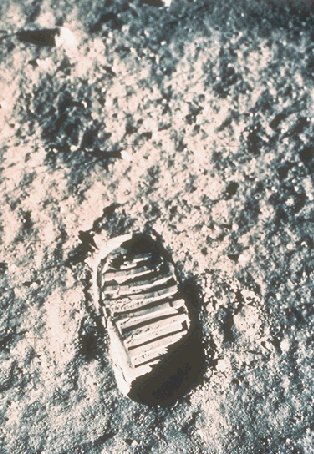 Left - Telecast of Neil Armstrong descending the lunar module ladder just prior to taking his first step on the moon. The TV camera automatically deployed after Armstrong pulled on a special ring. As he stepped onto the moon's surface he proclaimed, "That's one small step for man, one giant leap for mankind" - inadvertently omitting an "a" before "man" and slightly changing the meaning. "...one small step..." Mid - Close-up of the footprint from the first step. Right - Buzz Aldrin poses for a photo beside the United States flag. The lunar module is seen on the left. Numerous footprints are now clearly visible in the fine grained, powder-like soil.