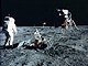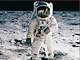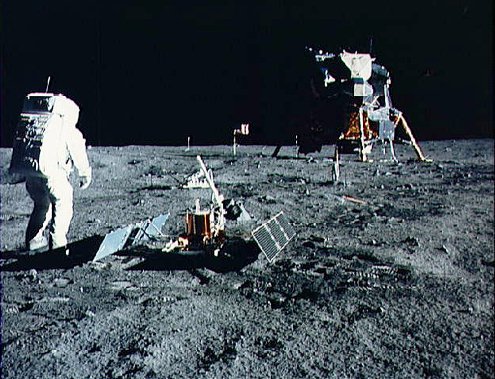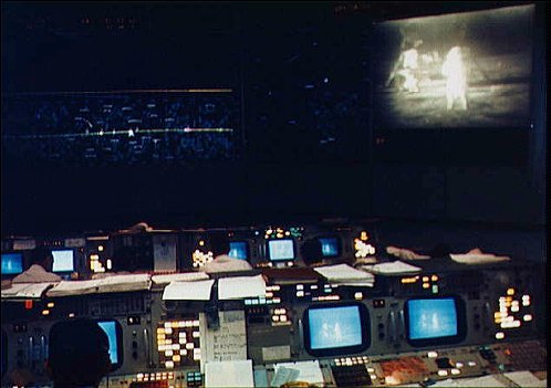 Left - Buzz Aldrin faces the camera as his helmet reflects the lunar module and Neil Armstrong taking his picture. Armstrong kept the camera and took many photos of Buzz, but none were actually taken of him. Mid - At Mission Control, the large television screen shows the astronauts on the moon. They then received a live message from President Nixon. Right - Buzz Aldrin after deployment of scientific experiments including a seismograph for detecting lunar quakes and a laser reflector to bounce back beams from Earth to calculate the exact distance to the moon. The astronauts spent a total of 2.5 hours walking on the lunar surface in gravity only one-sixth as powerful as Earth's. They then went back into the lunar module to rest and prepare for departure.