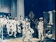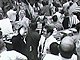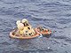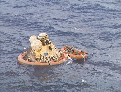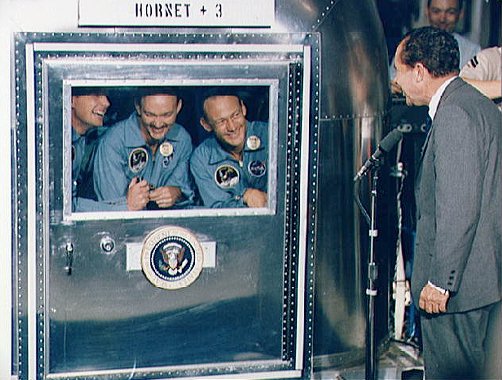 July 24, splashdown after 8 days, 3 hours, 18 minutes. Left - The command module afloat in the Pacific Ocean, 825 miles from Hawaii. The astronauts are wearing biological isolation suits as a precaution against any "moon germs." Mid - At Mission Control a spontaneous celebration of the successful conclusion of the Apollo 11 Lunar Landing Mission. Right - President Richard M. Nixon greets the Apollo 11 Astronauts, who are now quarantined, aboard the U.S.S. Hornet.