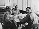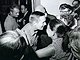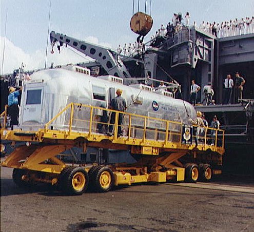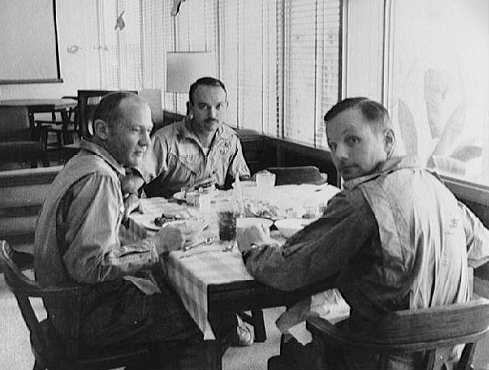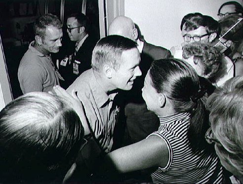 Left - In Hawaii, the Mobile Quarantine Facility containing the astronauts is offloaded from the U.S.S. Hornet. The Facility was then transported to NASA in Houston. Mid - The astronauts dine together during the tedious weeks of quarantine at the Lunar Receiving Lab where they were tested extensively for any signs of exotic infection. Right - August 10, after a clean bill of health and release from quarantine, Neil Armstrong is greeted by friends in the crew reception area.