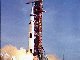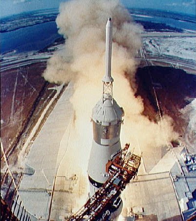 July 16, 1969. Left - Liftoff of the Apollo 11 Lunar Landing Mission as the 363 ft. tall space vehicle is launched from Kennedy Space Center at 9:37 a.m. Mid - View from the launch tower of the smoke and flames from the five engines of the Saturn V rocket which generate 7.5 million pounds of thrust. Right - The launch tower is cleared. Twelve minutes later, the astronauts are in orbit 120 miles above the Earth at 17,400 mph, then begin their four day journey to the Moon, nearly a quarter of a million miles away.