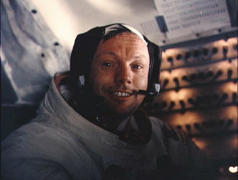 Sunday, July 20, landing day. Left - Astronaut Neil Armstrong in the lunar module. Right - Astronaut Buzz Aldrin in the lunar module.